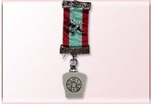 He also wears a breast jewel in the form of a keystone suspended from a ribbon of light blue and crimson.