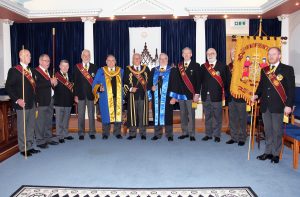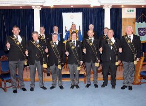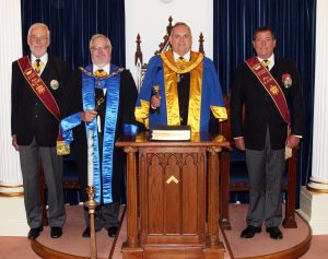 The image on the left shows the new Provincial Grand Supreme Ruler with his Deputy Worthy Brother Gareth Callan and the Grand Arch of Steel made up from the Provincial Arch of Steel.